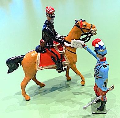A French Imperial Guard Lancers Officer to command my French Army Cavalry. (A Dorset Soldiers cast as the unpainted one behind). It is based on an iconic Britains mode.ReversoA mounted Rifles Officer (A cast by Dorset Soldiers painted by me)A British Observation Balloon that come as a gift from Paul Watson!A French Observation Balloon wit Pigeon Carrier included!DetailIf you look closely you will see a mounted French Standardbearer I forgot to take a detail pic of… I changed my mind before painting him and substitued a sword at the carry for the flag. (Part of my French Army Collection today FINISHED!)Detail of the High Command of the French Army.Not forgetting “Brigitte” the cantiniere… that was a surprise gift from Anthony Spencer (DORSET SOLDIERS)… it would be used to boost the moral (mind, not talking about her morals) of the French Army using mainly COGNAC!