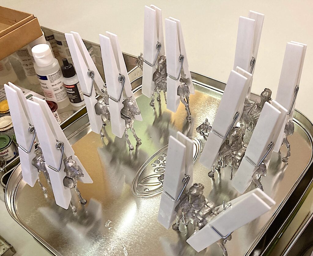 I learned to disassemble the horses using a vice, a screwdriver and a hammer! (long years messing with toy soldiers without using a hammer!). But so far so well, I did a “new” horse with two different parts (one from each horse – a bit with tail and a bit with a good rear leg -) see pics (worth a thousand words).