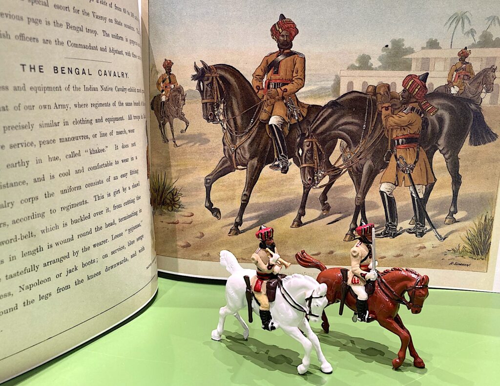 It would command my Cavalry once painted as a Scot Grey. Have added the plume with milliput not in the pic) and will add one pic when fully painted.A part of my collection consists of Bengal Lancers in Parade Dress, I first got the Tradition of London dismounted figures at the front, and then bought some W.Britains Centenial sets to have the mounted Toy Soldiers… as usual I elaborated a bit and got for the mounted sets a British Officer, an Indian Officer and a Stndardbearer… buying two sets of each it gives you two “redundant” figures a bugler and an officer… Antony Spencer from DORSET SOLDIERS did some of the conversions… and I did the rest. Nearly finished.A simple paintjob transform an officer of Hodson’s Horse (Blue tunic) into a Governor’s Bodyguard Officer (red tunic). Quite easy and straighforward.As it was broken… why not try to repair?Success with the first quickly implied disassemble the next one…Now, using the two unbroken parts… a horse with a good rear leg and tail appears… (add a new head and right arm… and a brand new Toy Soldier will be added to the collection)Works in process as described… Bengal Lancers, “New General”, “New Flag”, “NEW headgear for the FFL Adjudant… etc.Two half castings united…New horse hide… and slow progress…Two modified Toy Soldiers (change of right arms and new colour scheme)Added to unit.Added a mounted officer USMC 1900Bugle instead of pistol…Standardbearer instead of corporal firing pistl… and now on thw USMC instead of the 66th.3 Units finished… (Love Bengal Lancers)Detail 1Detail 2Detail 3Working on them!Resurrected!slowly getting there…A new tail, a new head, a new ADCSuperglue and fixing together the two halves of mounted toy soldiers casts (REPLICA)VarnishedInspiration come from a pic on the first ITSC book!Used the one on the right as a model for the one on the left… (meaning how to fix a sword).New figures added.The British “India” Khaki Collection.